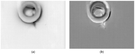 The reconstructed images by the first two principal components are shown in Figure 8, which shows the enhanced features of the cracks. Compared to the original IR image in Figure 7d, the background noise has been greatly eliminated in Figure 8a, but the location and geometry of the segments of Crack I and Crack II are not greatly enhanced. The main reason may come from the remaining effect of non-uniform heating along the annular coil. However, from Figure 8b, we can see that Crack I and Crack II are well separated from the surrounding areas because the effect of non-uniform heating is almost eliminated. Hence, it is easy to characterize the important features of the segments of the two cracks from Figure 8b. Besides, with the help of the PCA method, the crack information can be automatically obtained from an IR image sequence to avoid the trouble of manually identifying defect information from a large number of IR image frames. Therefore, the PCA method is proven as one of the effective methods to improve the detectability of ECPT for surface cracks on matrix of PDC bit by greatly enhancing the features of cracks from the image reconstructed with the second principal component.