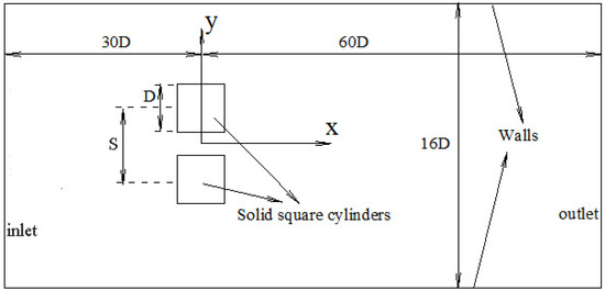 A view of the computational domain is disclosed in Figure 1. A two-dimensional obstructed duct with two side-by-side obstacles is modelled. Computational domain is subjected to a free stream with parabolic speed and uniform temperature (Th = 310 K). It is assumed that the stream is incompressible, time dependent, and laminar. The obstacles and duct walls are kept at constant temperature (Tc = 300 K). Two side-by-side obstacles with sides D are mounted in the duct. S is the gap between the centers of the obstacles. The upstream and downstream lengths of the duct are fixed as 30D and 60D, respectively. The duct height is considered to be 16D. The gravity is in the stream-wise direction.