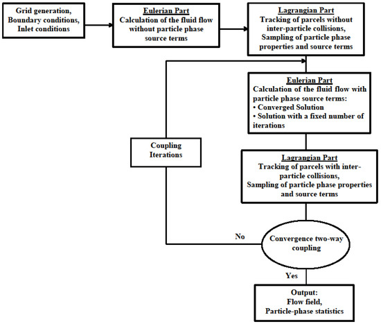 For two-way coupling of Eulerian-Lagrangian approach, the liquid phase is treated as a continuum by using the Eulerian approach, while the dispersed particles can be tracked by applying a Lagrangian approach. The heat, mass, and momentum can be exchanged between two phases [25,26]. The equations for two phases are presented separately as follows: