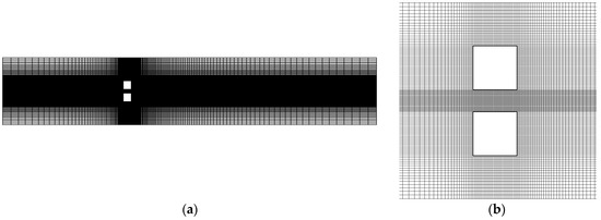 Mesh distribution (a) whole domain (b) near the obstacles.