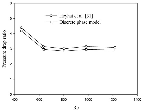 To examine the accuracy of the numerical results, the numerical outputs are benchmarked with experimental results obtained by Heyhat et al. [36]. The case for validation is aluminum oxide-water nanofluid flow with dp = 40 nm and Φ = 0.01 in a straight tube. The results of comparison between the experimental and numerical results are presented in Figure 4 for the variations of pressure drop ratio with Reynolds number. The pressure drop ratio is defined as the ratio of pressure drop of nanofluid to that of pure water. This comparison showed good agreement between the experimental and numerical results with a relative error about 5%.