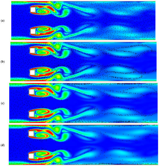 Dispersion of the particles inside the duct for (a) dp = 30 nm; (b) dp = 0.1 μm; (c) dp = 0.25 μm; (d) dp = 0.5 μm at Re = 100, S/D = 3.5, and Φ = 0.01.