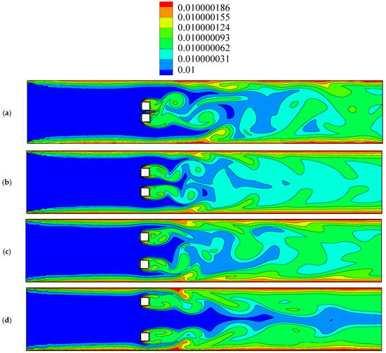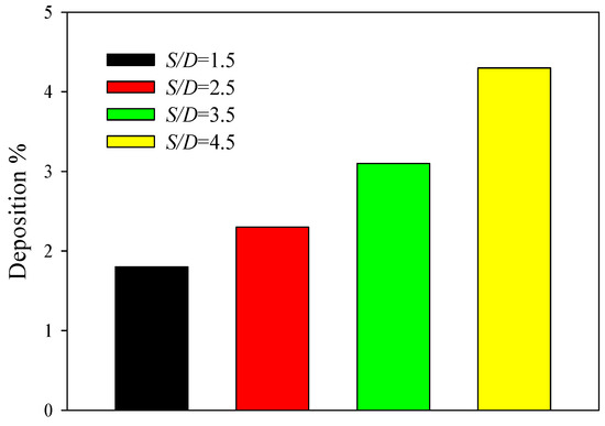The effects of space ratio values on the particle deposition at Re = 100, Φ = 0.01, and dp = 0.1 μm are disclosed in Figure 8. It is observed that the particle deposition enhances with an enhance in the value of space ratio. As mentioned earlier, the particles are affected by the flow in the near wake region for dp = 0.1 μm. As the space ratio value increases, the distances between obstacles and duct walls decrease and the wake region of each obstacle transfers to the regions near the duct walls. Hence, the number of particles near the center of the duct reduces considerably and this leads to an increase in the number of particles that deposit on the duct’s surfaces. The particle deposition percentages are about 1.8%, 2.3%, 3.1%, and 4.3% for S/D = 1.5, 2.5, 3.5, and 4.5, respectively.