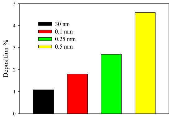 Effects of particle diameters on the particle deposition at Re = 100, Φ = 0.01, and S/D = 1.5 are disclosed in Figure 7. The deposition is defined as the ratio of the number of deposited particles on the all involved surfaces containing surfaces of obstacle and duct to the number of particles injected to the duct. It can be observed that the particle deposition enhances with an enhance in the particle diameter. This may be justified by the effect of gravity force on the particle deposition that becomes more significant for higher values of particle diameters. The particle deposition percentages are about 1.1%, 1.8%, 2.7%, and 4.6% for dp = 30 nm, 0.1 μm, 0.25 μm, and 0.5 µm, respectively. Note that the trap boundary condition with a restitution coefficient of 0 is considered as the particle boundary condition on the surfaces of the duct and obstacles for evaluating particle deposition because for the reflect boundary, the particle deposition is zero as the restitution coefficient is equal to 1.