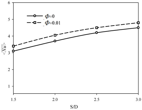 Variation of mean Nusselt number with space ratios for Re = 100, dp = 30 nm, and two values of solid volume fraction of nanoparticles.