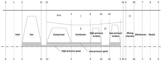Consider an aircraft turbofan engine shown in Figure 1, which consists of the fan, the compressor, the combustor, the high pressure turbine( HPT), the low pressure turbine (LPT), the mixing chamber, the afterburner and the exhaust nozzle. The numbers in Figure 1 denote the main sections of the turbofan, which are taken as the subscript of the related signals, such as the exhaust nozzle area .