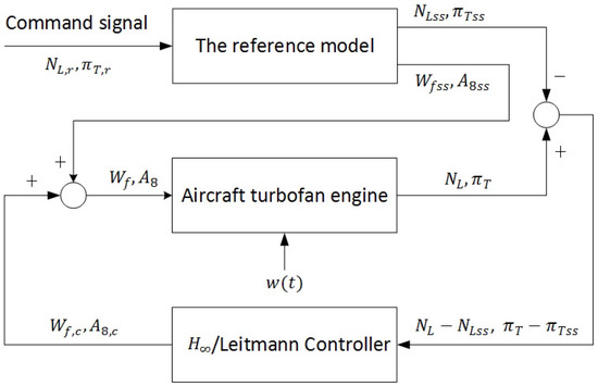 In order to conquer the mentioned problems in the aircraft engine control, researchers have been putting great efforts into the methods of robust control. The linear quadratic regulator (LQR) method has strong robustness and a simple structure, which was applied to the F100 aircraft engine and other linear systems [4,5]. In the multivariable control of the F100, the LQR method was utilized to design the proportional part of the control. While the LQR method relies on a nominal linear system model and needs to know all of its states, if nonlinearity, uncertainty and modeling errors, which cause the remarkable mismatch between the dynamics of real systems and their models, exist, the characteristics of the LQR controller will deteriorate evidently. As was mentioned in [4], if the gain of LQR controller was not in the gain schedule, the system stability was unable to be guaranteed. To solve the problem that the LQR method cannot be utilized with the lack of partial states, the linear quadratic gaussian(LQG) method adopts the Kalman filter as a state observer to estimate the states and realize the state feedback control [6,7]. However, the Kalman filter weakens the robustness. The simulation in [6] shows that since the engine dynamics changes significantly due to the low temperature reaction in the combustion process, the performance of the LQG controller becomes worse. In [7], for the dynamics of homogeneous charge compression ignition (HCCI) engines remains invariant, the robustness of the discrete-time LQG methods cannot be verified sufficiently. To enhance the robustness of the LQG method, the loop transfer recovery (LTR) design is added to achieve the LQG/LTR approach for a linear system [8,9]. In [9], a non-full recovering LQG/LTR approach is applied to a turbofan engine. No uncertainty nor noise are considered in the controller design, and the system is actually a nominal system. The performance of the LQG/LTR controller is only validated at one operating condition, namely, km, . When facing a complicatedly-varying dynamics, such as the dynamics of turbofan engines, the LQG/LTR controller may hardly recover the transfer function desired. The control theory attracts many researchers in robust control design, especially in the noise elimination by setting a disturbance rejection level from noises to outputs. The research works in this field are numerous [10,11,12,13]. The proportion integral derivative (PID) control method is practically applied to turbofan engines; while the three parameters, proportional, integral and differential, need to be adjusted at different operating conditions [14,15]. This brings the drawbacks that the parameters of the controller are numerous and the parameter adjustment lacks a theoretical support.