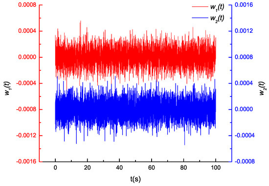 where is a random number and is a sine function. By simple calculation, we know . Let , and is a white noise with zero expectation. The noise and the uncertainty are shown in Figure 3 and Figure 4.