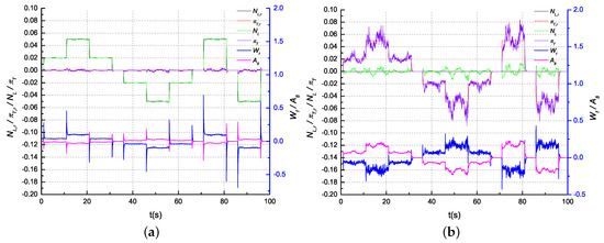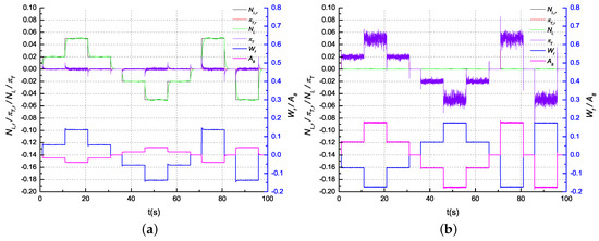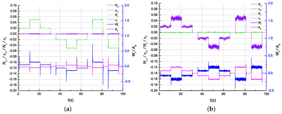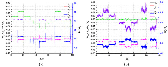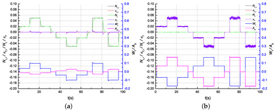 We adopt the LQR controller (45) to conduct the same simulation procedure as that in Figure 5. The results are shown in Figure 7. By comparison with Figure 5a,b, respectively, we can find that, in Figure 7a, steps cause around perturbations of , and in Figure 7b, ’s overshoots reach around . Both of these results are greater than those in Figure 5.