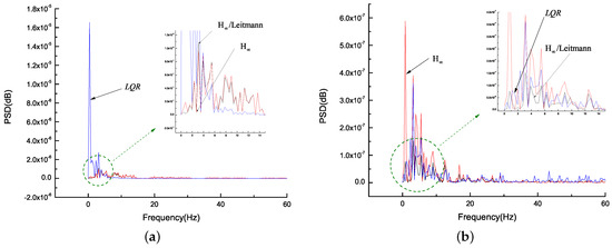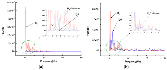 PSDs of the state responses during the steps and under the different controls. (a) PSDs of ; (b) PSDs of .