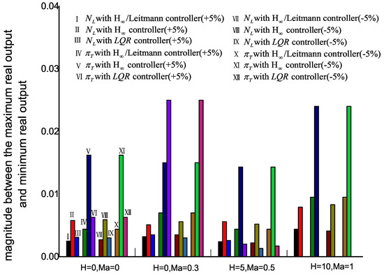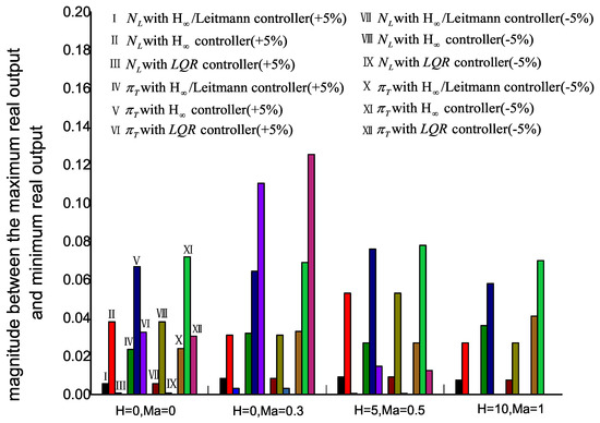 With the varying of the operation point in the flight envelope, the characteristics of the turbofan changes nonlinearly. To validate the robustness of our controller in the flight envelop, we chose three more conditions: km, ; km, ; km, ; applying the same /Leitmann controller to these three operating points and making the same simulation procedure as that at . Figure 10 shows the results of km, . For comparison, the same simulations were performed with the controller and the controller. The corresponding results are shown in Figure 11 and Figure 12, respectively. The statistics of the output extremes under all four operating conditions are listed in Table 1 and Table 2. The magnitude between the maximum and the minimum is drawn in Figure 13 and Figure 14.