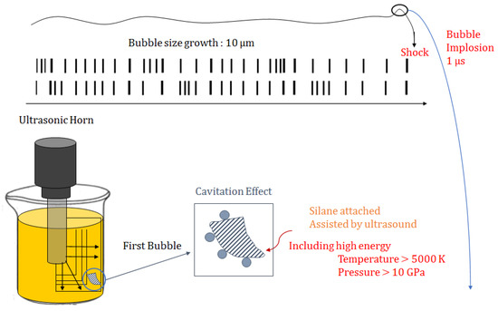 In order to prevent the agglomeration of the epoxy resin and the HNT (DOORICHEM, Seoul, Korea) nanoparticles, the additives were dispersed using an ultrasonic dispersion device. The cavitation effect as shown in Figure 1 is generated by high-intensity ultrasound. When ultrasonic waves are introduced into the solution, a wave forms and propagates through the liquid. At this point, positive pressure is generated in the direction the wave is moving, instantly leaving the negative pressure behind. This difference in pressure creates waves, and as these get larger, millions of microcavities of microscopic vacuum bubbles are generated. The bubbles easily form in hollows or cavities and implode violently due to the change in the pressure of the ultrasonic waves. At this point a strong shock wave forms caused by strong liquid jets and swirls. The collapse of the microcavities occurs in microseconds (µs), taking place many million times in a very small area. Pressures of more than 10 GPa and temperatures of 5000 K are reached [4,7]. The force generated at this time is powerful enough to corrode the propeller of a ship or generate noise. By applying the cavitation effect to the composite material, the penetration of the polymer resin into the carbon fiber was facilitated.
