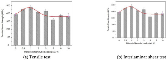 Tensile strength was investigated to evaluate the effect of HNTs on the tensile strength of carbon fiber-reinforced composite material. The respective mean value of the eight sets was calculated excluding the minimum and maximum values. These results are shown in Figure 2a. The tensile strength of the test specimens increased in accordance with the added amount of HNT content up until 1 wt %. However, the tensile strength tended to decrease after 1 wt % HNT content. In particular, the specimen with an HNT content of >5 wt % had a smaller tensile strength than the specimens with no added HNT. In the case where the content of the HNT increased beyond a certain level, it is believed that by increasing the cohesion of the HNT, the tensile strength decreased according to the stress concentration in the agglomerated HNT.