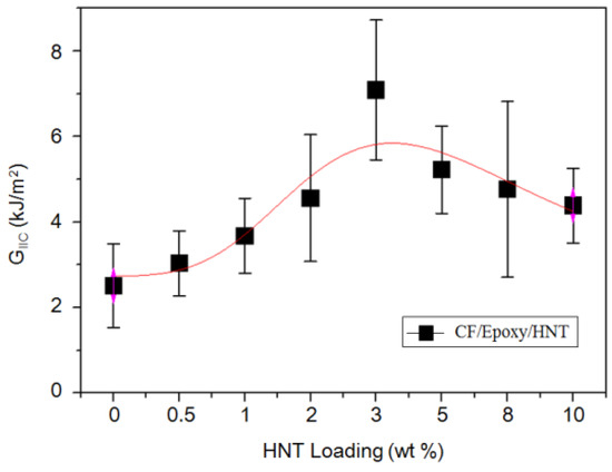 - The size of GIIC due to the addition of HNT increased up to 3 wt %, but decreased thereafter. With increasing HNT content, the aggregated part due to the dispersion of HNT is locally acting as a stress concentration, decreasing the fracture energy.