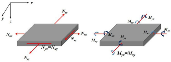 The displacement and the strain of the composite laminate under load are different from those of the single layer composites, because of the interaction between the layers. In the composite laminate, the lamination angles are different for each layer, so the stiffness and strength are different for the same external force. The force and moment applied to the laminate can be obtained by integrating different forces and moments for each layer depending on the laminate thickness. Assuming the planar stress state of the laminates, the forces and moments applied to the laminates are as follows.