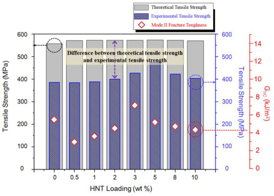 A graph of the relationship between the theoretical tensile strength, the experimental tensile strength, and the interlaminar fracture toughness of CFRP according to the HNT content.