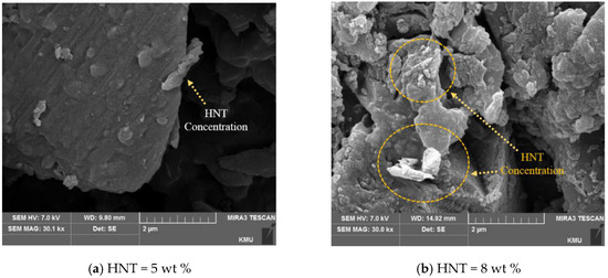 The cohesion of the HNT in the carbon fiber reinforced composite material was investigated by SEM. Figure 8 shows the photograph of specimens taken at 5 wt % HNT having the highest tensile strength value, and at 8 wt %, the tensile strength decreases with increasing content. The photograph of the sample with 8 wt % HNT shows a considerable amount of agglomerated HNTs.