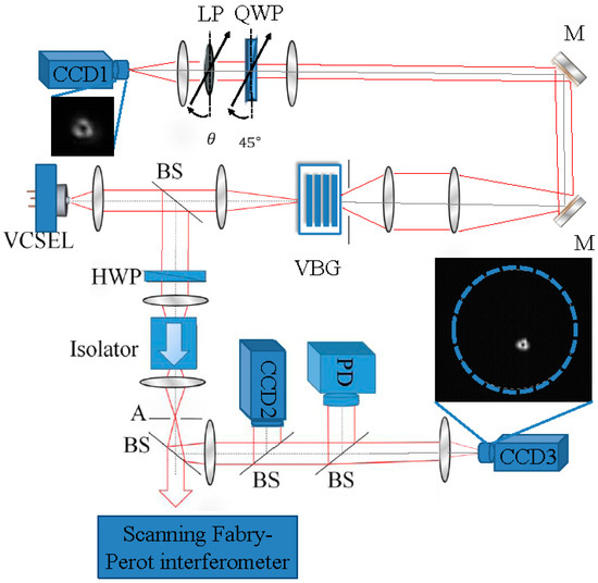 The use of the intra-cavity BS also allows measurements without feedback. However, the main results for the polarization distributions are obtained by observation after the VBG, as the intra-cavity polarization state can be accessed directly from there. The light that goes through the VBG is re-imaged onto another CCD-camera (CCD1) by two telescopic systems, providing enough magnification to accurately resolve the different polarization zones. Within the collimated range between the two lenses of the second telescope, a linear polarizer (LP) and a quarter-wave plate (QWP) are used with different combinations in its orientation.