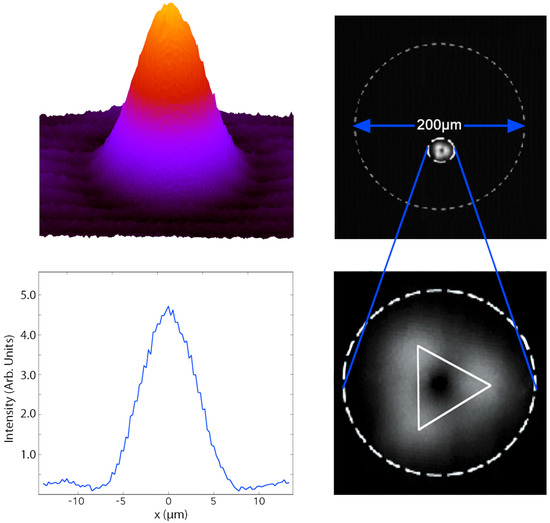 A more complicated structure than the single soliton appears at higher values for the injection current, as can be seen in the picture corresponding to zone II in Figure 2. This emission pattern is normally made by a three-peak ring with a central hole in the middle and we can call it an optical vortex [23,24]. Its dimensions are of about ten microns for the distance between peaks; a plot of this structure is shown in Figure 3.