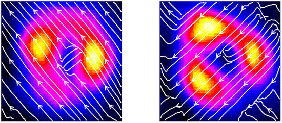 Total intensity for the vortex case showing two-peak structure in the left and three-peak structure in the right part of the figure. The polarization streamline representation for the two orthogonal polarization orientations that appear in the vortex beam reaches values very close to those of the single soliton.