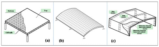 Typical large-span Vierendeel roof system structures composed of a honeycomb sandwich structure: (a) plane; (b) curved surface; (c) gabled frame.