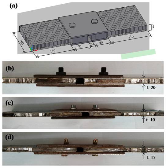 The planar dimensions of a concatenated honeycomb sandwich specimen are shown in Figure 3a. The plate thickness has three specifications: 10, 15, and 20 mm. The thicknesses of the top and bottom plates are 1 mm. The length and thickness of a regular hexagon honeycomb core’s side is 6 mm and 0.05 mm, respectively. The connectors include a high-strength bolt, an ordinary bolt, and a self-tapping bolt. Three specimens are made for each group with a total of 27 specimens. As the purpose of this study is to investigate a connector’s failure mode and failure mechanism [24,25,26,27,28], the connector failure prior to the plate material failure (connected matrix) should be avoided. Therefore, each side only contains a single bolt connection. The test is based on a displacement load method, which evenly applies tension to a specimen according to a specified load pattern at a continuous rate of 1 mm/min until failure occurs. As aluminium honeycomb core material is relatively soft, internal pads are attached at both ends to prevent the honeycomb core at both clamps from being flattened during loading and at the bolt connection point to avoid local pressure failure when a specimen is prepared.