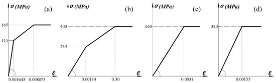ANSYS software is employed to create a corresponding honeycomb sandwich structure connector finite element model for the previously mentioned test specimen [29,30]. The honeycomb sandwich structure material properties are as follows: elastic modulus E = 70.0 GPa, shear modulus G = 27.0 GPa, yield stress σ0.2 =115.0 MPa, and ultimate stress σb = 165.0 MPa. Figure 4 shows the simplified constitutive relationships assumed for each part of the modeled specimen. The honeycomb core is modeled with shell elements while facesheets are modeled with solid elements [31,32,33]; core and facesheets are connected by contact elements [34,35]. As the model has symmetric geometrical dimensions, boundary constraint, and load, the analysis is based on a semi-structure, unidirectional, and uniform displacement load is applied to the end surface of the honeycomb sandwich structure at the slip end.
