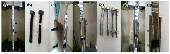 Specimen failure process; (a–c) High strength bolt connector; (d,e) Ordinary bolt connector; (f,g) Self-tapping bolt connector.