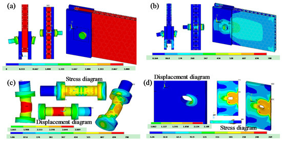 Figure 6 shows the deformation and stress from the finite element analysis for the connector failure. As shown in Figure 6a,b, the total stress on the honeycomb sandwich structure is relatively high; the honeycomb core and the honeycomb facesheets, pad, and connection plate have relatively small displacements; the displacement at the opening suddenly increases; the bolt develops bending deformation under load. The total stress on the honeycomb sandwich structure is primarily less than 260 MPa. However, severe stress concentration occurs at the contact points among the opening, bolt, and connection plate.