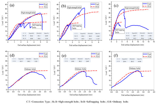 Comparison of experimental tests and FE simulations for the load-displacement curves relative to different bolt connections and sandwich wall thicknesses. (a–c) High strength bolts and self-tapping bolts; (d–f) Ordinary bolts.