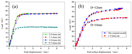 Load-displacement curves determined by ANSYS for (a) models with different hole-edge distances; (b) models with different bolt diameters.