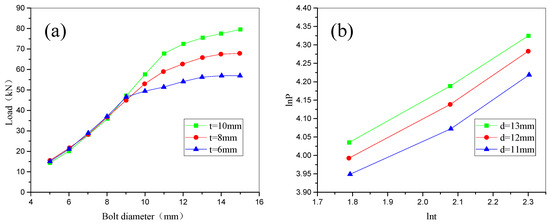 Variation of connector’s shear load capability with respect to (a) bolt diameter and (b) sandwich wall thicknesses. (lnt = loge(t), lnP = loge(P)).