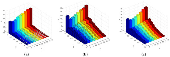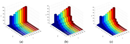 To acquire a more accurate statistical result for the increased delay of the paths, tests are done with 100 (times) * 100 (periods). The increased propagation delay and the increased number of the hops of all the paths are recorded and the distribution results are presented. Figure 5 and Figure 6 show the tradeoff between energy saving and delay caused by ICWGA of the three topologies. For a more clear presentation, for each topology, only the results for half of the cases are shown. It can be seen that in each case, either for the propagation delay or for the improved number of hops, the percentage of 0 accounts for the largest part. For all the topologies, as increases the percentage of 0 gradually increases except for the smallest of cases. As shown in Figure 5, for the increased propagation delay, 0 accounts for 85% when in the Abilene topology, 27% when in the India topology, and 30% when in the Germany topology. The other part accounts for a small percentage. For the increased number of hops, as presented in Figure 6, there even exist some regions corresponding to the negative increased hop numbers, which means the paths calculated by ICWGA pass fewer hops than the shortest paths. This is because the shortest paths are calculated based on the propagation delay in the simulation. Compared to the results for the propagation delay, the 0 parts account for bigger percentages, 92% when for the abilene topology, 52% when for the India topology, and 55% when for the Germany topology; the percentage of 1 accounts for the largest part in the other cases.
