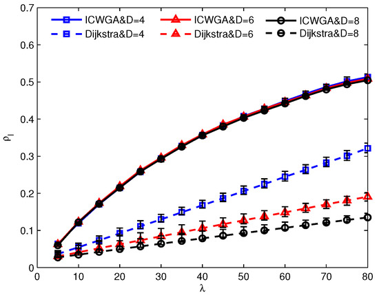 In order to evaluate the effect of link density on ICWGA, three sets of random topologies with same number of nodes and different link densities generated by Brite are used. Each set includes five random topologies. Link density is denoted as D in the results. In the simulation, the number of the nodes , and .