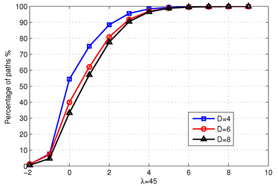The cumulative distribution of the increased number of hops for the topologies with .