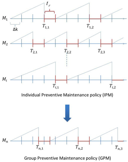 18] considered a series system of machines processing different types of jobs. They used a genetic algorithm in order to find the optimal group preventive maintenance policy (the optimal preventive maintenance interval) as well as the assignment of jobs on machines. Results are compared to an individual preventive maintenance policy in order to show the effectiveness of the used approach. In the work of Renna et al. [