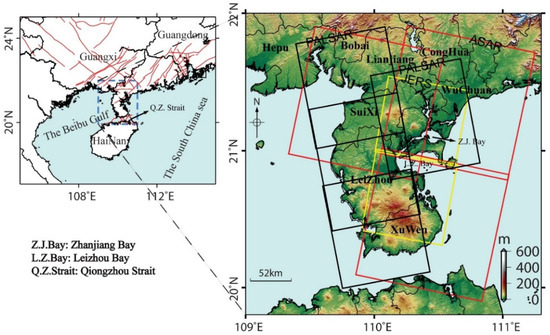 Background setting (left) and Synthetic Aperture Radar (SAR) coverages (right) of the Leizhou Peninsula. The yellow, red, and black rectangles represent the coverage of JERS, ENVISAT, and ALOS1 respectively.