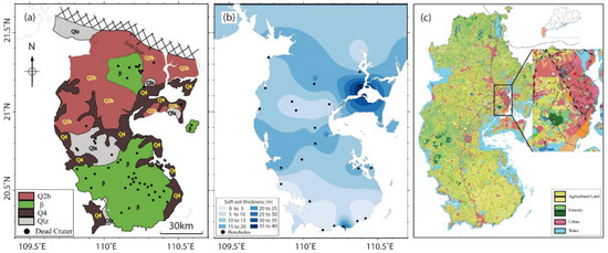 Geology and land use maps of the Leizhou Peninsula (LZP) (modified from [3,15,16]). (a) is the geology map with four kinds of compressible deposits: Beihai group of middle Pleistocene age (Q2b); basalt of Himalayan Period (β) with lots of dead craters represented by black dots; Zhanjiang group of Lower Pleistocene age (Qlz); recent sediments of Quaternary age (Q4); the black dots represent the dead craters in LZP; (b) is the distribution of soft soil thickness derived from the interpolation of 22 boreholes represented by black dots [16]; (c) is the land use map derived from Zhanjiang Municipal Bureau of Land and Resources (ZMBLR) [3], the inset is an enlarged view of Zhanjiang city.