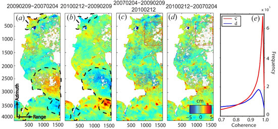 Atmospheric delay and differential interferograms before and after pair wise logic calculation. (a) interferogram between image 20090209 and 20070204; (b) interferogram between image 20100212 and 20090209; (c) stacking interferogram after summing Figure 3a,b, aiming to reduce the atmosphere effects of image 20090209; (d) interferogram between image 20100212 and 2070204 after using direct interferometry; (e) the coherence histogram of Figure 3c,d. Black dashed lines in Figure 3a,b show areas with serious atmospheric delays and red rectangles in Figure 3c,d represent zones selected for coherence comparison. Red and blue solid lines in Figure 3e represent the coherence histogram of Figure 3c,d. (Date format: yyyymmdd).