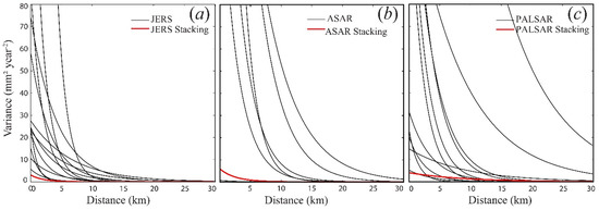 Exponential covariance function of velocity of each interferogram before (black) and after (red) atmosphere phase screen (APS) correction with our modified stacking method. (a–c) show results of the frame covering Zhanjiang city with JERS, ENVISAT, and ALOS1, respectively. Every black curve represents the statistical result of an interferogram in the stacking for each platform.