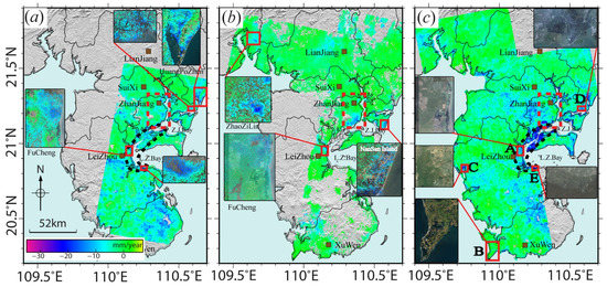 Average subsidence velocity of the LZP from 1992 to 2010. (a) Mean velocity map of JERS from October 1992 to September 1998; (b) mean velocity map of ENVISAT from October 2003 to May 2007; (c) mean velocity map of ALOS1 from December 2006 to July 2010. Positive velocities (yellow) represent uplift, while the negative values (purple) indicate subsidence. Brown squares are representative of city’s locations. The red dashed rectangle is the representative subsidence area covering Zhanjiang city shown in Figure 7. Rectangle A, B, C, D, and E in Figure 5c are five representative areas in Figure 10. The locations are abbreviated as follows: the Leizhou Bay (L.Z.Bay), the Zhanjiang Bay (Z.J.Bay).