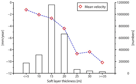 Relationship between soft soil thickness and mean vertical velocity. The white bars represent the number of pixels and the red diamonds represent the calculated mean velocity for each soft soil thickness interval.