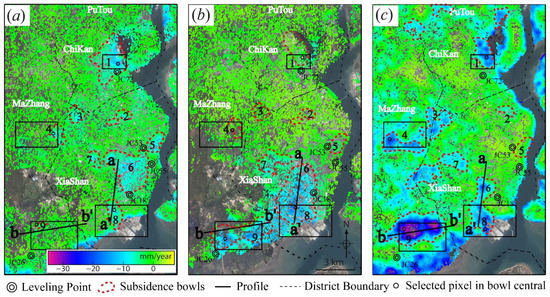The spatial-temporal evolution of land subsidence in Zhanjiang city. (a) Average subsidence rate of JERS from Octorber 1992 to September 1998; (b) average subsidence rate of ENVISAT from October 2003 to May 2007; (c) average subsidence rate of ALOS1 from December 2006 to July 2010. Zhanjiang city consists of four districts, namely Chikan, Xiashan, Potou, and Mazhang. Black dashed lines indicate the district border. Areas marked with red dashed lines are land subsidence bowls; Black circles are the leveling stations and two black solid lines are selected profiles of the subsidence bowl by aa’ and bb’.