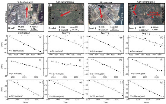 Deformation time-series of central points in four selected bowls, i.e., bowl 1, 4, 8, and 9, for each platform. The first row (a–d) represents the location of central points with optical backgrounds derived from GoogleEarth. The circles, diamonds, and triangles represent the location of JERS, ENVISAT, and ALOS1 respectively. Black words around the optical images are the adjacent land classes. The red star in (d) is a waterworks named Lindong started in 1999; The second to fourth rows represent the deformation time-series of four points for JERS, ENVISAT, and ALOS1. The red arrows represent the movement direction of land subsidence. The dashed lines in (e–p) are the results of linear fitting of the deformation time-series. The word ‘V=’ in (e–p) is the mean velocity in the vertical direction.