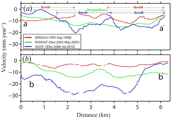 Two bowl subsidence profiles (aa’ and bb’) in Figure 7. (a) aa’ profile going through subsidence bowl 6 and bowl 8 in the urban area. Two separated bowls, i.e., Bowl 6 and Bowl 8, represented by red merged into one bowl represented by green, and then became two connected bowls represented by blue; (b) bb’ profile going through subsidence bowl 9 in the suburban area, the mean velocity grows with increase of time. The red, green and blue solid lines represent the mean velocity of JERS, ENVISAT and ALOS1 datasets.