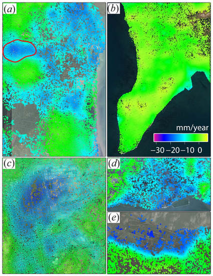 Average deformation rate of the five representative coastal areas for ALOS1 dataset from December 2006 to July 2010. (a–e) are enlarged views of the red rectangles in Figure 4c. (a) is an area covered with large-scale farmlands, the maximum subsidence rate is 18 mm/year; (b) is located at the south of LZP with a maximum subsidence rate of 13 mm/year and a uplift rate of 3 mm/year; (c–e) are areas with large-scale aquaculture, the maximum subsidence rates are 23, 20, and 23 mm/year, respectively.