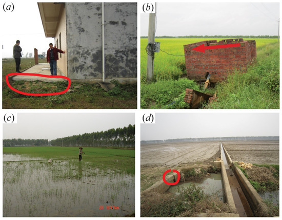 Field photos of non-uniform subsidence of a building (a) and a pump facility (b), cracking and settlement of a channel (d) caused by over-exploiting groundwater in Fucheng town. (c) Flooded crops caused by rapid subsidence.