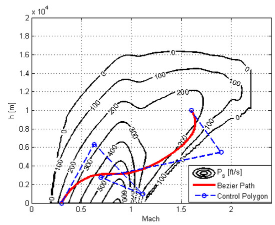 To exploit the fact that the general form of optimal trajectories in the h-M plane can be estimated using E-M theory, in the present study, Bezier splines [34] were selected for the generation of climb paths in the form of two-dimensional curves in this plane. These are parametric curves built around polynomial expressions, known as the Bernstein polynomials. A Bezier curve of order n is defined by a set of control points, through , under the formula: