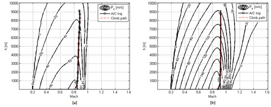 Altitude (h)–Mach number (M) plots of the climb paths used for simulation validation for: military (a); and maximum (b) power settings. The climb paths are plotted over contours of Specific Excess Power, expressed in m/s.