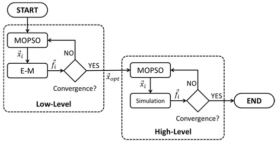 As with most similar algorithms, a variety of multi-objective variants of PSO have been proposed expanding the method’s capabilities to handle multiple objectives in a single optimization run [36]. Among these, the Multi-Objective Particle Swarm Optimization (MOPSO) introduced in [21] represents one of the most popular approaches and has been adopted for this study. The method retains the basic features of PSO, its principal difference with the latter lying in the selection of the global best: Instead of a single position in search space, the global best is chosen from an external repository containing the members of the updated Pareto front by means of a roulette wheel selection scheme weighted in accordance with the local density of the front. The procedure comprises the following steps: